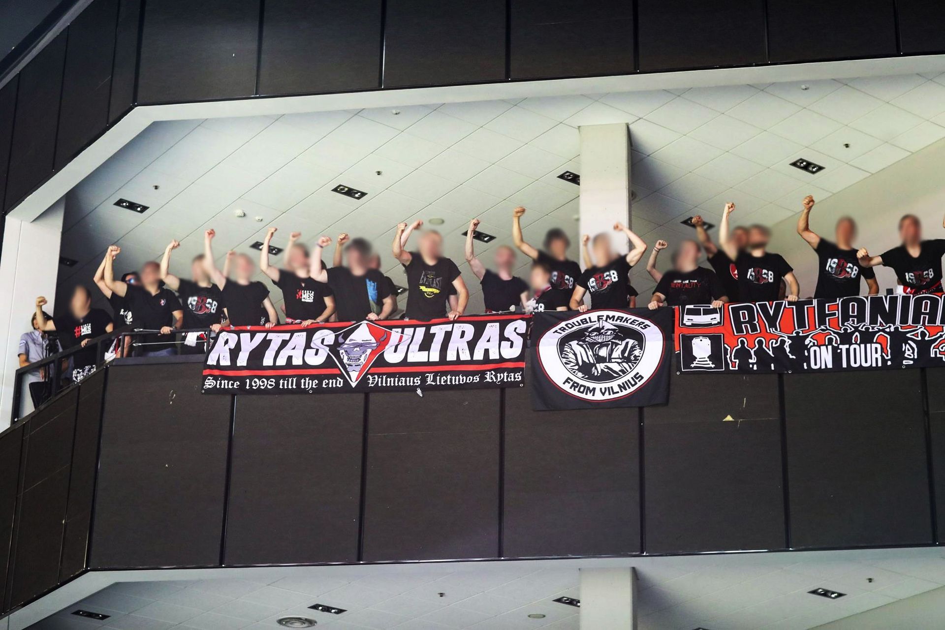 Žengę žingsnį pro arenos duris pamatome pareigūnų garbės koloną, kuri mums nutiesta tiesiai į autobusą. Pareigūnai pasiruošę tramdyti Vilniaus chuliganus, užsikabinę automatus, kurie mus labai gasdina. Bandome paaiškinti, jog visų pirma norime eiti pasitikti savo komandos, visų antra norime nueiti į parduotuvę nusipirkti kažko užkasti. Suvokti šiuos prašymus pradžioje buvo labai sunku, argumentas ,,supraskit, jūs esat sporto sirgaliai“ kelia šypsenas. Vis tik ,,ledus“ visada praleidžia išsitraukiamos kameros ir pradėjamas šnekėti įstatymų kalba, automatai šiaip ne taip nusileidžia ir galime eiti pasitikti savo komandos. Visi žaidėjai areną palieką neblogų nuotaikų, šiek tiek su jais pabendraujame ir keliaujame į parduotuvę.
